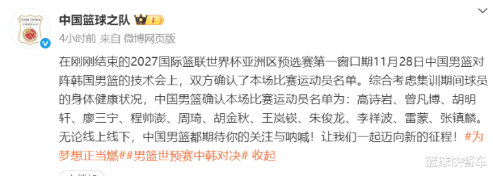 北京时间11月28日,男篮世预赛首秀,中国队将坐镇主场迎战韩国队。这一次,中国篮协倒是非常给力,提前一天便公布了男篮世预赛12人大名单,周琦、曾凡博、胡明轩领衔出战,不过,这一次男篮世预赛12人大名单,与前阵子亚洲杯12人比起来,一下子就少了赵睿、余嘉豪、赵嘉义以及王俊杰四人。尤其是赵睿的缺席,让男篮备受争议正规实盘配资网站,毕竟后卫线少了这样一个稳定火力点,对于中国队而言,确实是一个不小的打击。